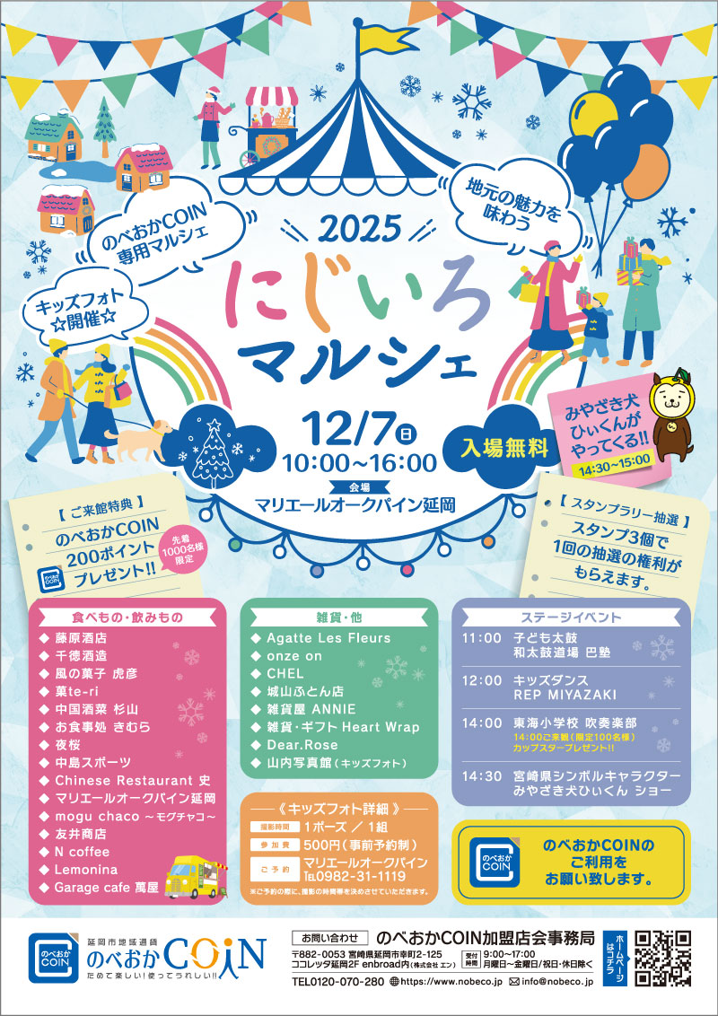今年も毎回大好評の、のべおかCOIN主催「にじいろマルシェ」を開催いたします。